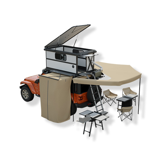 One-stop camping platform for SUVs. Includes roof rack, front wind diffuser with lights, auto Hybrid sleeping cabin, water tank (25L), SUV electric side steps, 270° manual awning, mobile kitchen, portable function table, and shower tent.